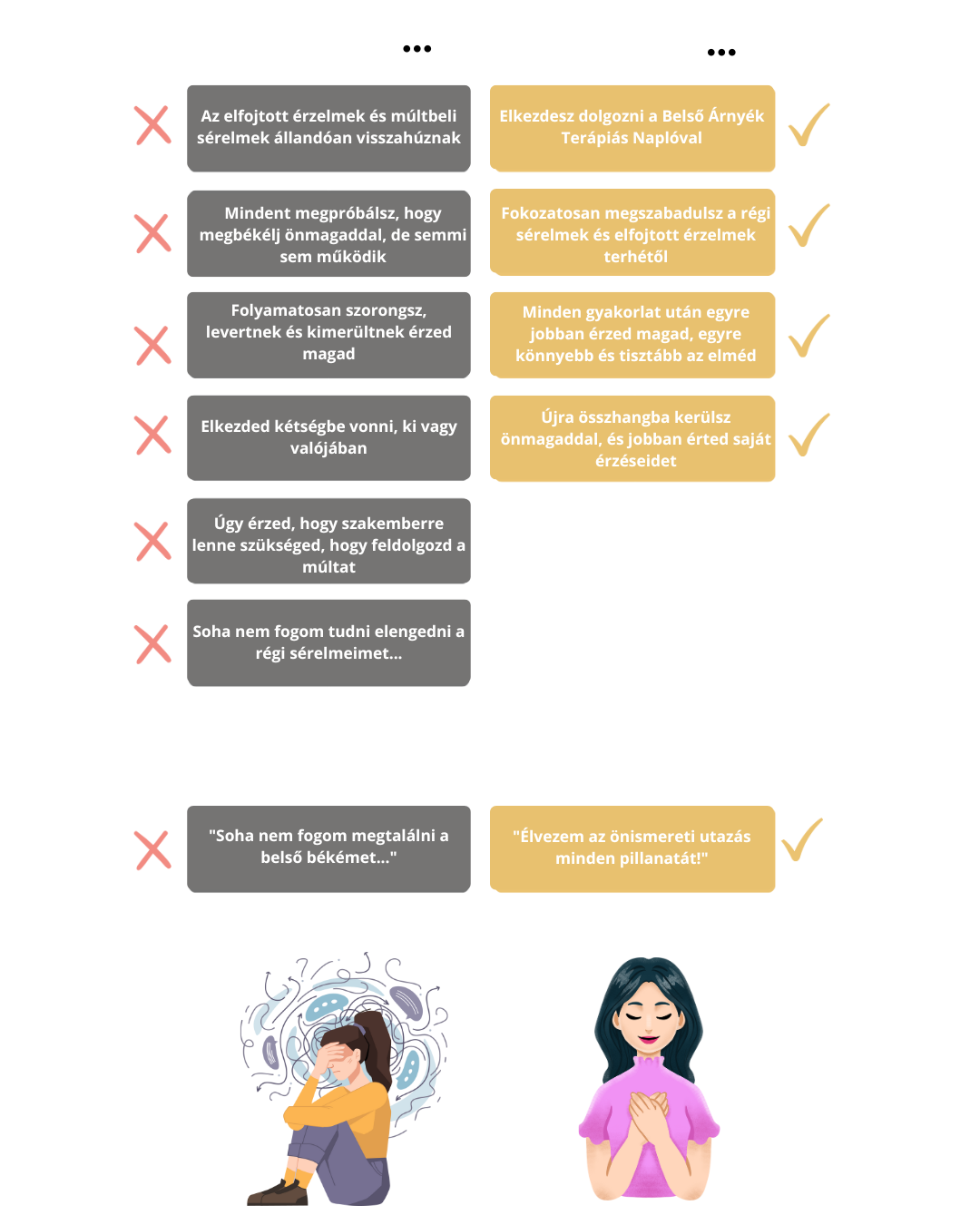 Nem fogod többé azt érezni, hogy valami nincs rendben veled. Pontosan így éreztem magam, amikor a saját árnyékaimmal küzdöttem… De ezekkel a gyakorlatokkal végre megkapod az eszközöket, hogy feltárd a rejtett részeidet, és újra önazonos és kiegyensúlyozott lehess..